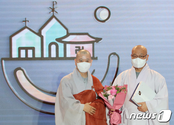 대한불교 조계종 사회부장 원경 스님(왼쪽)이 7일 오전 서울 중구 명동성당 꼬스트홀에서 열린 사회적경제와 함께하는 2021년 종교계 공동행사 기념식에서 담마협동조합 고창선언문화교육회관 관장 법만 스님에게 우수 사회적경제기업 종교지도자상을 수여 후 기념촬영을 하고 있다. 2021.10.7/뉴스1