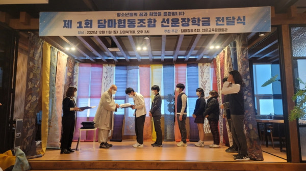 조계종 제24교구 본사 선운사에서 설립한 선운교육문화회관의 운영법인 담마협동조합(이사장 법만스님)은 12월11일 선운교육문화회관 안 담마북카페에서 고창군 거주 청소년을 대상으로 ‘제1회 담마협동조합 선운장학회’ 장학금 및 장학물품 수여식을 거행했다.