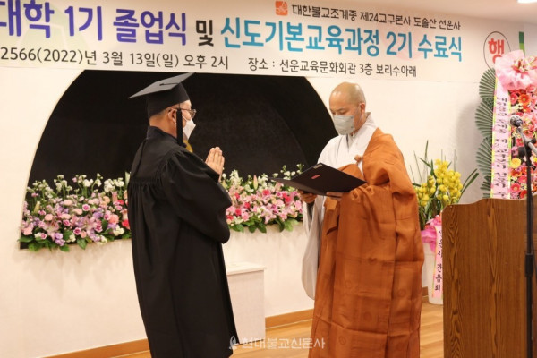 졸업생들을 대표 정만수 회장은 졸업사에서 “부처님의 가르침을 깊이 새기로 부처님의 동체대비사상을 자양분 삼아 몸소 실천하고 정진하는 불자로 거듭날 것을 다짐한다”면서 “어려운 여건 속에서도 열심히 정진해준 도반 여러분의 굳은 의지와 열정에 찬사와 감사를 전한다”고 말했다.