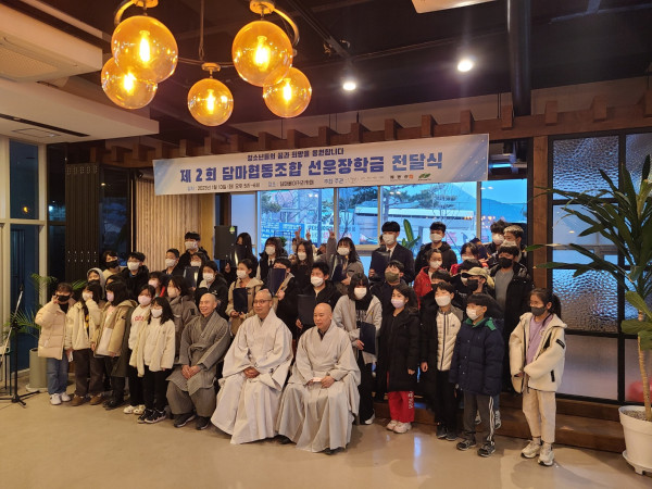 조계종 제24교구 본사 선운사에서 건립한 선운교육문화회관(운영법인 담마협동조합. 이사장 법만스님)이 1월10일 담마북카페에서 '제2회 담마협동조합 선운장학회'장학증서 전달식을 열였다. 이 자리에는 선운사 주지 경우스님과 담마협동조합 이사인 미소사 주지 종범스님, 상원사 주지 대륜스님 등이 참석하여 장학증서를 전달했다.